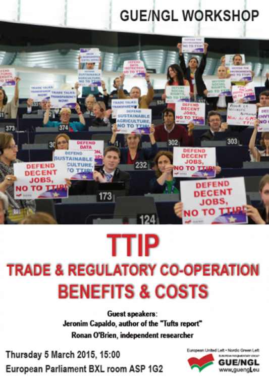 Der Optimismus von Merkel und Co. wird von der europäischen Linken nicht geteilt. Bei der Konferenz der Linksfraktion im EU-Parlament wurden Prognosen angeführt, die ganz und gar nicht in das rosige Bild der regierungsnahen Institute passen. Da im transatlantischen Handel inzwischen kaum noch Zölle erhoben würden, fiele deren Wegfall praktisch nicht ins Gewicht. Ins Zentrum seiner Untersuchungen stellte der nach Brüssel geladene Ökonom Jeronim Capaldo deshalb die Verschärfung des Wettbewerbs- und Kostendrucks, der Europa durch das Freihandelsprojekt drohe. Um mit niedrigen Arbeitskosten der US-Konkurrenten mithalten zu können, müssten Unternehmen in Europa massive Lohnkürzungen vornehmen.