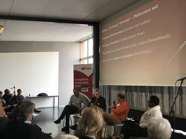 Aber nicht nur wirtschaftliche Fragen wurden diskutiert, sondern auch die Flüchtlingssituation. Diese hatte sich in Griechenland zwar nach Abschluss des Türkei-Deals vorerst entspannt, da eine Verlagerung auf Italien stattfand, doch seit einigen Wochen steige die Anzahl der ankommenden Flüchtlinge wieder. Unter anderem schilderte Thanasis Maramarinos (Fischer auf Lesbos) seine Erfahrungen, die er in den vergangenen Jahren auf Lesbos machte. Griechenland müsse die Folgen der Verweigerungshaltung anderer europäischer Staaten ausbaden. Täglich fahre er mit seinem kleinen Fischerboot aufs Meer hinaus, um den Menschen auf größtenteils nicht mehr seetauglichen und stark überfüllten Schlauchbooten zu helfen, die griechische Küste zu erreichen. Es fühle sich nicht richtig an, fischen zu gehen, während nur wenige  Meter entfernt Menschen mit dem Leben ringen. Mehrere tausend Menschen habe er bereits gerettet, darunter unzählige Kinder.