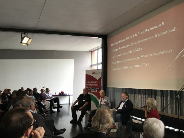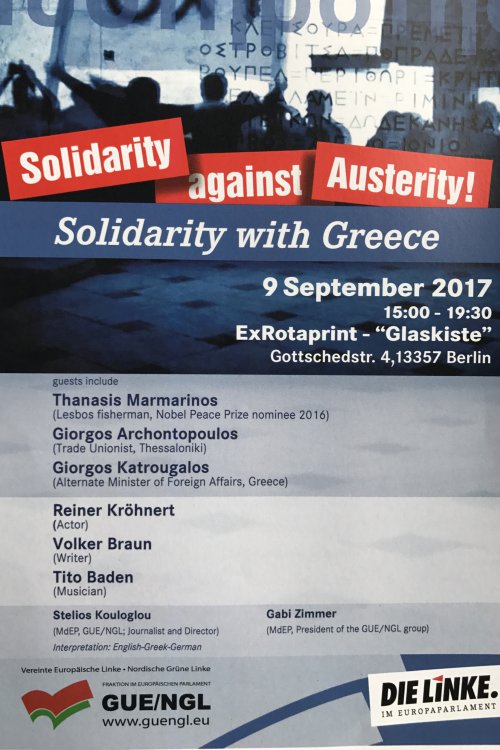 Am 9. September 2017 lud DIE LINKE. im Europaparlament zur Veranstaltung „Solidarity against Austerity!“ – Solidarität mit Griechenland in Berlin. Im Rahmen dreier Themenblöcke, untermalt von Musik und Kabarett, wurde über die aktuelle Lage in Griechenland diskutiert. Unter anderem sprachen Giorgos Katrougalos (Vizeaußenminister Griechenland) und Axel Troost (MdB, DIE LINKE) über die Kürzungsdiktate – eine Änderung des Wirtschaftssystems auf Europäischer Ebene sei notwendig, denn die neoliberal geführte Politik habe ebenso negative Auswirkungen auf Griechenland wie auch auf andere Staaten. Sinnvoller sei eine nachhaltige Wachstumspolitik statt Austerität!