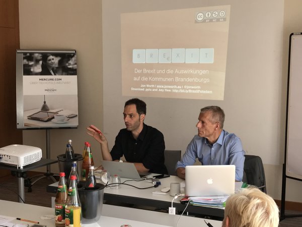 Im März 2017 hat das Vereinigte Königreich (United Kingdom – UK) die offizielle Austrittserklärung – hinlänglich als Brexit bezeichnet - aus der Europäischen Union (EU) bei der Europäischen Kommission in Brüssel hinterlegt und damit, entsprechend der Europäischen Verträge, den Austrittszeitpunkt auf Ende März 2019 festgelegt. Mehr als ein Jahr nach der Erklärung galt es für Helmut Scholz, Mitglied des Europäischen Parlaments (EP) aus Brandenburg, über den Zwischenstand der Verhandlungen zu informieren und, mit Blick auf Brandenburg, die Auswirkungen des Brexits auf die Kommunen zu beleuchten. Als Gastgeber des Tages fungierte das kommunalpolitische forum Land Brandenburg e.V. und als Co-Referent Jon Worth, seines Zeichens politischer Aktivist, Blogger zum Thema Europa und als Brite direkt vom Brexit Betroffener.