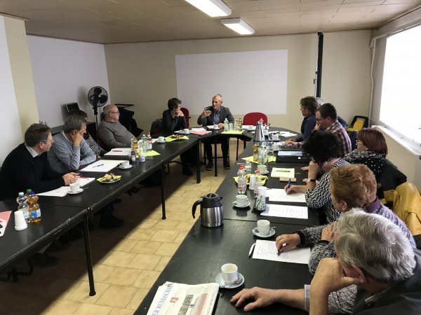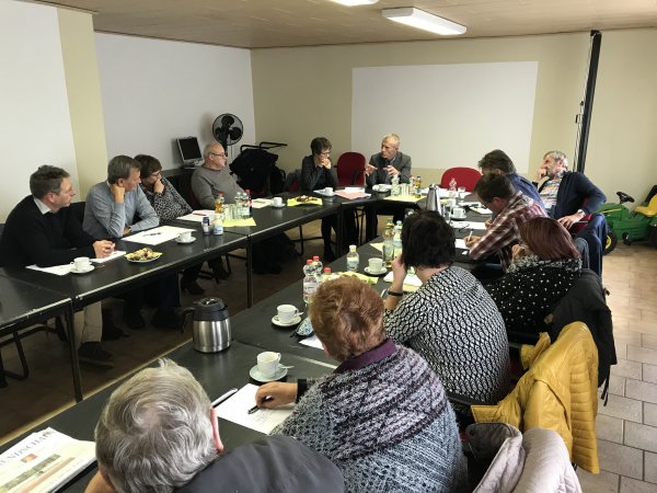 Helmut Scholz (Bildmitte, sitzend vor der weißen Tafel) während seiner Ausführungen.