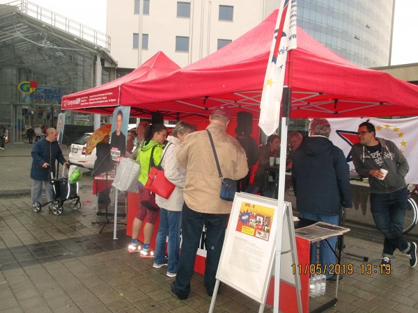 Trotz Regens informierten die Kandidatinnen und Kandidaten der LINKEN am 11. Mai die Bürgerinnen und Bürger der Stadt Cottbus vor der Stadthalle zu den Kommunal- und Europawahlen.