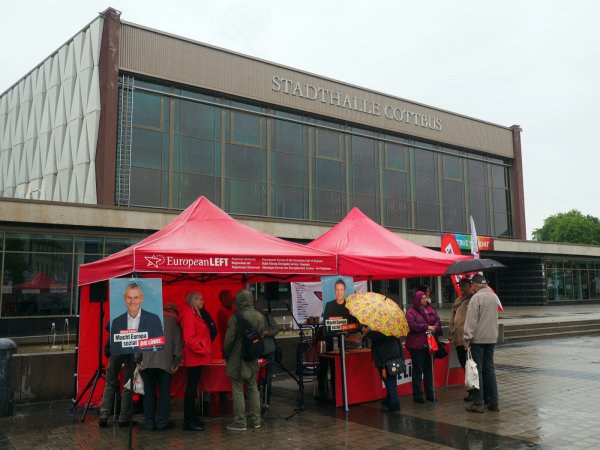 Der Infostand wurde von der LAG Netzwerk Europäische Linke (EL) initiiert und vorbereitet. Mit musikalischer Umrahmung durch den sorbischen Liederpoeten Bernd Pittkunings wollte man nicht aufgeben und dem sehr schlechten Wetter trotzen. Durch das Angebot, sich im roten LINKEN-Zelt zu informieren, kam es zu Bürgergesprächen beispielsweise über den Ablauf der Wahlen oder auch Anfragen, wie der beschlossene Strukturwandel in der Lausitz erfolgen soll. Welche Perspektiven wird es für die Kumpel geben?