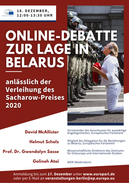 Anlässlich der Verleihung des Sacharow-Preises 2020 an die demokratische Opposition in Belarus lädt das Verbinungsbüro des Europäischen Parlaments in Deutschland am 18. Dezember von 12:00-13:30 Uhr zu einer Debatte über die Lage in Belarus ein: